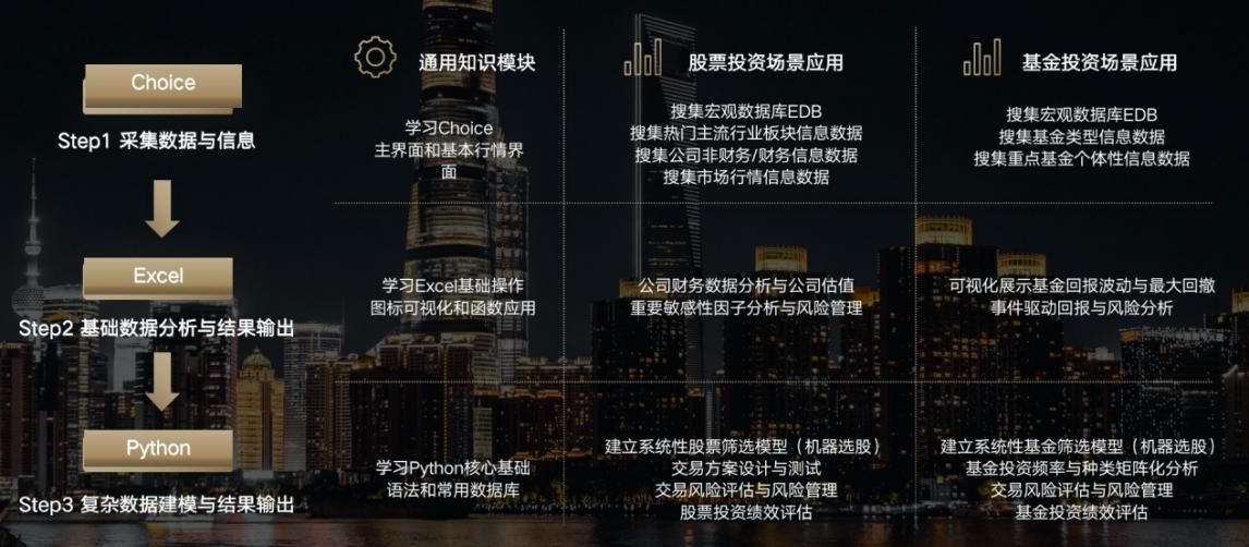 金融行业最核心的3 大实务技能-EXCEL 数据分析,Choice 金融终端使用,python 金融数据分析。在数据爆炸的时代,掌握数据获取能力、数据处理能力、及数据建模能力,是金融菁英在瞬息万变的金融行业保持竞争力的策略之一。