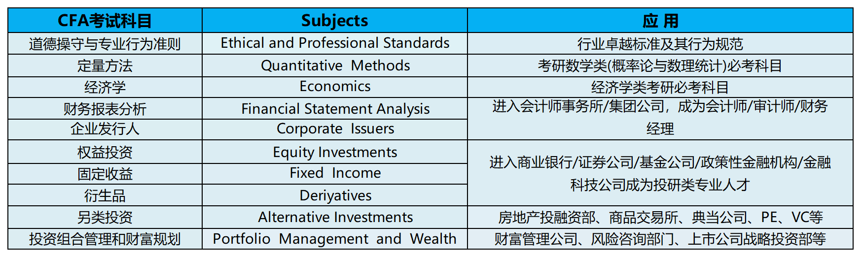 CFA 考试分三个级别,每个级别包含十个金融学习科目,内容涵盖了所有金融行业需要的专业知识,被誉为金融界的MBA。