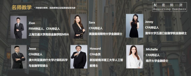 CFA 校内班的师资配置,从全球招募各个金融领域的优秀讲师,要求具备国内外顶尖院校硕士以上学历,具备摩根、中金等世界500 强企业工作从业经历,有5 年以上教学经验的职业讲师。如下列举部分师资: