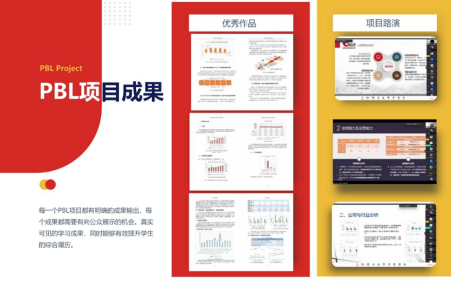 完成4 个PBL 项目学习,包括企业战略咨询、行业研究、企业投融资、决策组合管理与风险管理。最终形成成型的项目研究报告等成果物,这些成果将可助力求职、升学、参加比赛,甚至投入生产。