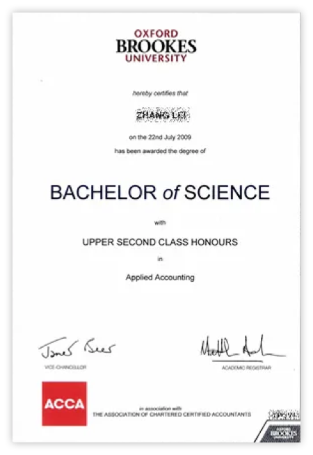 在通过ACCA-F阶段考核后,可以申请牛津布鲁克斯大学应用会计学理学学士学位,通过P阶段考核后,可以申请伦敦大学硕士学位。无需出国,即可拿到海外学历证书。