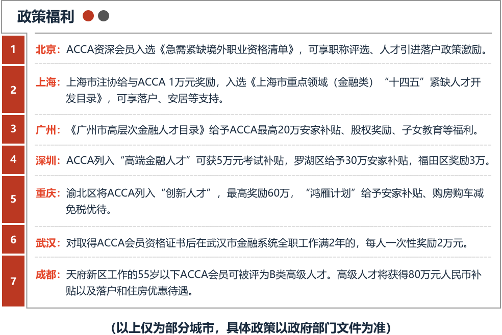 ACCA会员因其专业素养、国际视野和高标准的职业操守广受各地方政府认可,包括北京、上海、广州在内的超过21个省市已将ACCA人才纳入高端人才发展目录,作为重点引进培养对象。