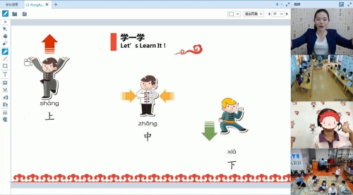 “孩子们对课程非常感兴趣,在摄像头前表现得很活跃,但是刚开始的时候他们并不愿意开口说汉语,更小一点的孩子还在地毯上爬来爬去。”有多年成人对外汉语教学经验的王老师笑着说,“这与成人汉语教学很不一样,对授课老师的课堂组织管理提出了非常高的要求,但是上了几节课之后,孩子们慢慢适应了在线学习,开始积极参与课堂活动,老师对课堂的掌控也更加自如。”
