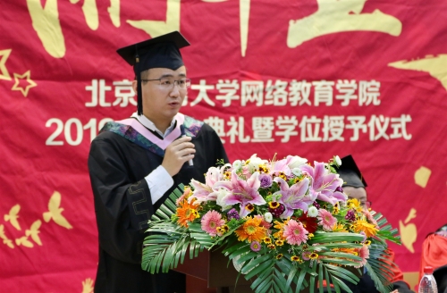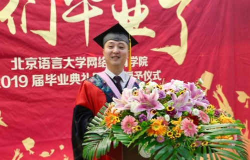 接着周明同学代表本科毕业生发言,他首先对学院全体教职工作者表示崇高的敬意和衷心的感谢。在发言中,周明同学回顾了他是如何与北语网院结缘,在顺利毕业后,自己的职业生涯也因此发生了重大转折,从普通基层员工,顺利转岗成为一名集团总部办公室秘书。最后周明同学表示,在以后的工作生活中,自己将牢记北语“德行言语,敦睦天下”的校训文化,自觉服务祖国,投身新时代的奋斗实践中,将北语的家国情怀发扬绽放。