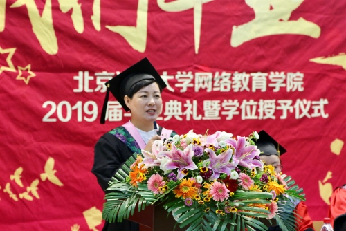 随后优秀毕业生王丽同学代表优秀毕业生发言,她表示因为北语网院,时隔二十年,自己终于完成了年少时的梦,凭借着对北语的向往和对学习的热爱,在克服种种困难拿到了梦寐以求的北语毕业证书。也正因为在北语网院就读汉语国际教育专业,自己有机会将汉语和中华民族传统文化带到了非洲,为中非友谊贡献自己的一份力量,为实现中华民族的伟大复兴而奋斗。最后,感谢学校可以举办这次毕业典礼,让大家能有机会相聚,这些都是人生中宝贵的经历。在北语网院学习的每一天,都是精彩难忘的一天。